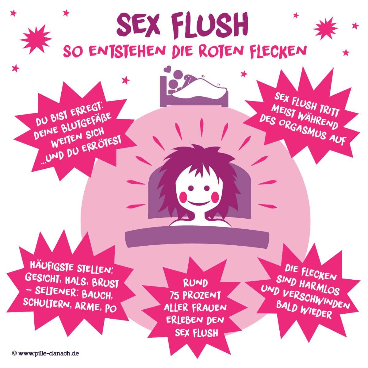 Der Sex Flush ist eng verwoben mit den Phasen des weiblichen Höhepunkts. Bei einigen Frauen tritt er schon in der sogenannten Plateauphase auf, wenn eine konstante Erregung vorliegt. Passenderweise liegt der Höhepunkt des Sex Flush auch bei deinem Höhepunkt. In der entspannenden Rückbildungsphase nach dem Orgasmus verschwinden die roten Pünktchen meist wieder. Sie sind völlig harmlos und lediglich ein Anzeichen für deine Erregung.